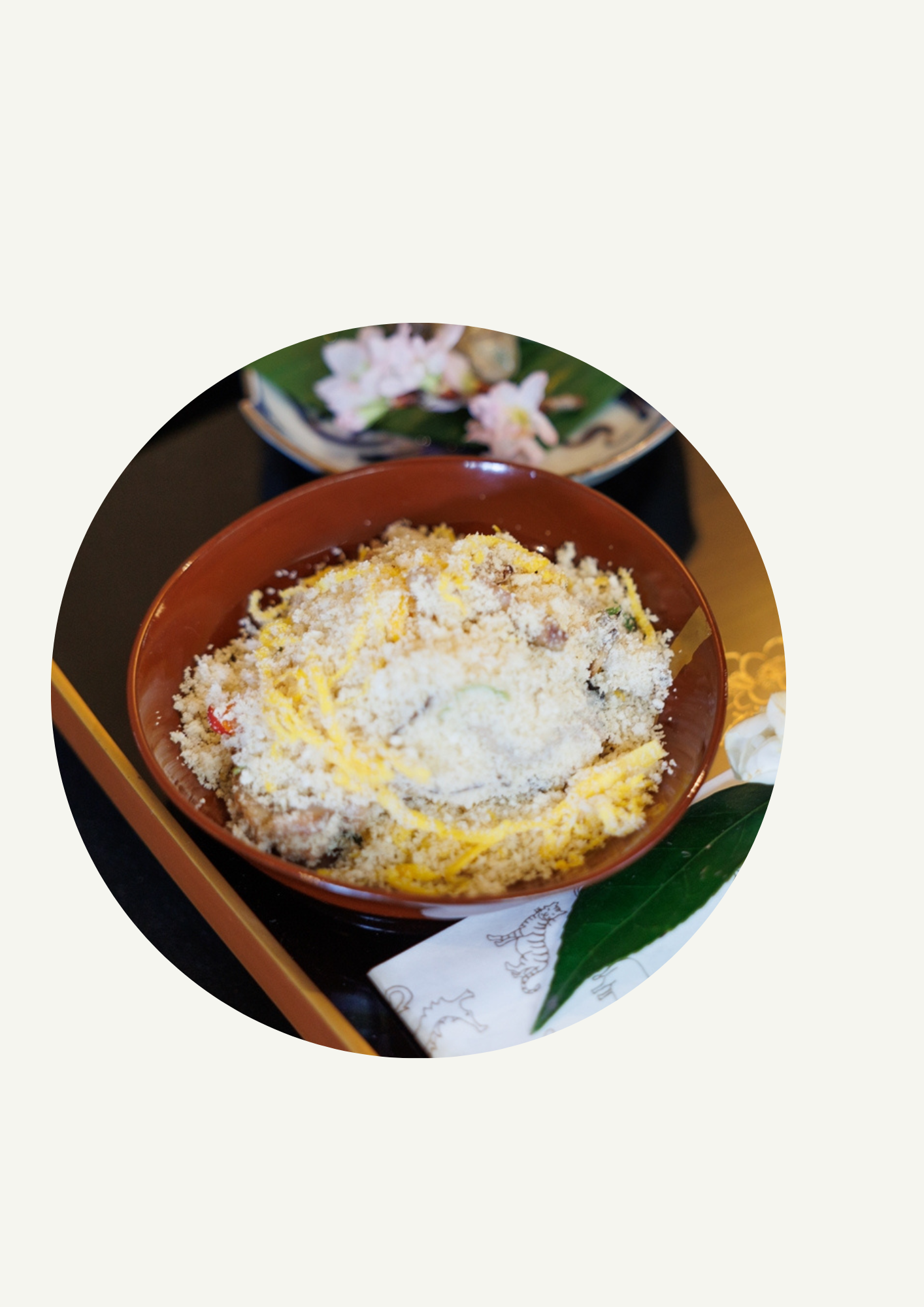 宮島の正月料理「雪花漬け」をお召し上がり下さい。おからを主体としたちらし寿司のようなお料理です。